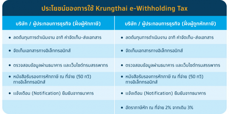 จึงต้องเจอกับความยุ่งยาก ซับซ้อนอยู่เสมอ ดังนั้น การเกิดขึ้นของระบบ “e-Withholding Tax” จึงเป็น Solution ที่ตอบโจทย์ให้กับทั้งองค์กร ผู้ประกอบการธุรกิจ นักบัญชี และซัพพลายเออร์ โดยมี “ธนาคาร” รับหน้าที่เป็นคนกลางในการดำเนินงานต่าง ๆ อำนวยความสะดวก ทั้ง “ฝั่งบริษัท/ผู้ประกอบการธุรกิจที่เป็นผู้หักภาษี” กับ “ฝั่งผู้ถูกหักภาษี”