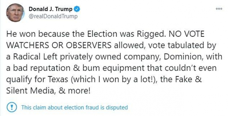 "เขาชนะเพราะการเลือกตั้งมีการโกง ไม่มีผู้เฝ้าดูหรือผู้สังเกตการณ์ได้รับอนุญาตแม้แต่รายเดียว ผลคะแนนถูกนับโดยบริษัทที่พวกซ้ายหัวรุนแรงเป็นเจ้าของอย่างลับๆ" ทรัมป์ทวีตเมื่อเช้าวันอาทิตย์ที่ 15 พฤศจิกายน แสดงท่าทียอมรับความพ่ายแพ้อย่างชัดเจนที่สุดจนถึงขณะนี้