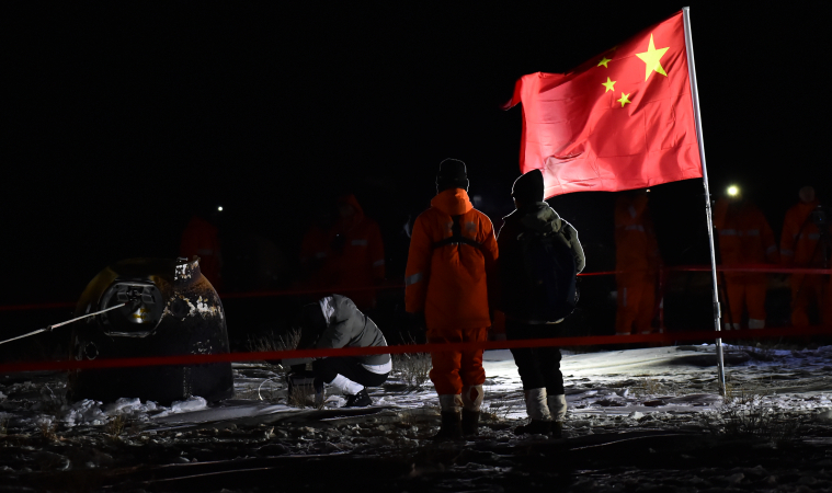แคปซูลของยานสำรวจดวงจันทร์ "ฉางเอ๋อ-5" ของจีนที่บรรทุกตัวอย่างหินและดินที่เก็บจากดวงจันทร์ ลงจอดที่เขตปกครองตนเองมองโกเลียใน หลังเวลา 01.30 น.เล็กน้อยของวันพฤหัสบดีตามเวลาท้องถิ่น เป็นการเก็บตัวอย่างจากดวงจันทร์ครั้งแรกในรอบมากกว่า 40 ปีหลังภารกิจอพอลโลของสหรัฐและภารกิจลูนาของโซเวียตในช่วงทศวรรษ 1960-1970