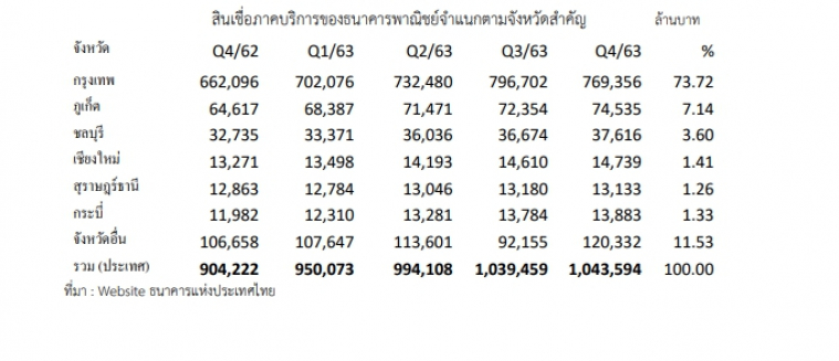 เมื่อพิจารณาเงินสินเชื่อภาคบริการของธนาคารพาณิชย์ไทย ซึ่งส่วนใหญ่เกี่ยวข้องกับธุรกิจท่องเที่ยว ณ สิ้นธันวาคม 2563 มียอดคงค้าง 1,043,594 ล้านบาท สินเชื่อส่วนใหญ่ 74,535 ล้านบาท หรือร้อย 73.7 กระจุกตัวที่กรุงเทพ สำหรับเมืองท่องเที่ยวสำคัญ 5 เมือง ได้แก่ ภูเก็ต ชลบุรี เชียงใหม่ กระบี่ สุราษฎร์ธานีมีสัดส่วนร้อยละ 15 ของสินเชื่อภาคบริการรวม โดยที่การกระจุกตัวของสินเชื่อแต่ละจังหวัดแตกต่างกัน โครงสร้างนักท่องเที่ยวของแต่ละจังหวัดต่างกัน เช่น จังหวัดภูเก็ต พึ่งพานักท่องเที่ยวต่างชาติเป็นสำคัญ คุณภาพสินเชื่อของผู้ประกอบการแต่ละรายก็ต่างกัน ผู้ประกอบบางแห่งอาจมีปัญหาไม่มีใบอนุญาตดำเนินธุรกิจโรงแรม จึงเชื่อว่าธนาคารแห่งประเทศไทยและสถาบันการเงินรวมทั้งผู้เกี่ยวข้อง จะมีแนวทางปฏิบัติออกมาเพื่อให้สามารถช่วยเหลือผู้ประกอบการอย่างตรงเป้าทั่วถึงและอยู่รอดได้ซึ่งเป็นเป้าหมายสำคัญของมาตรการนี้