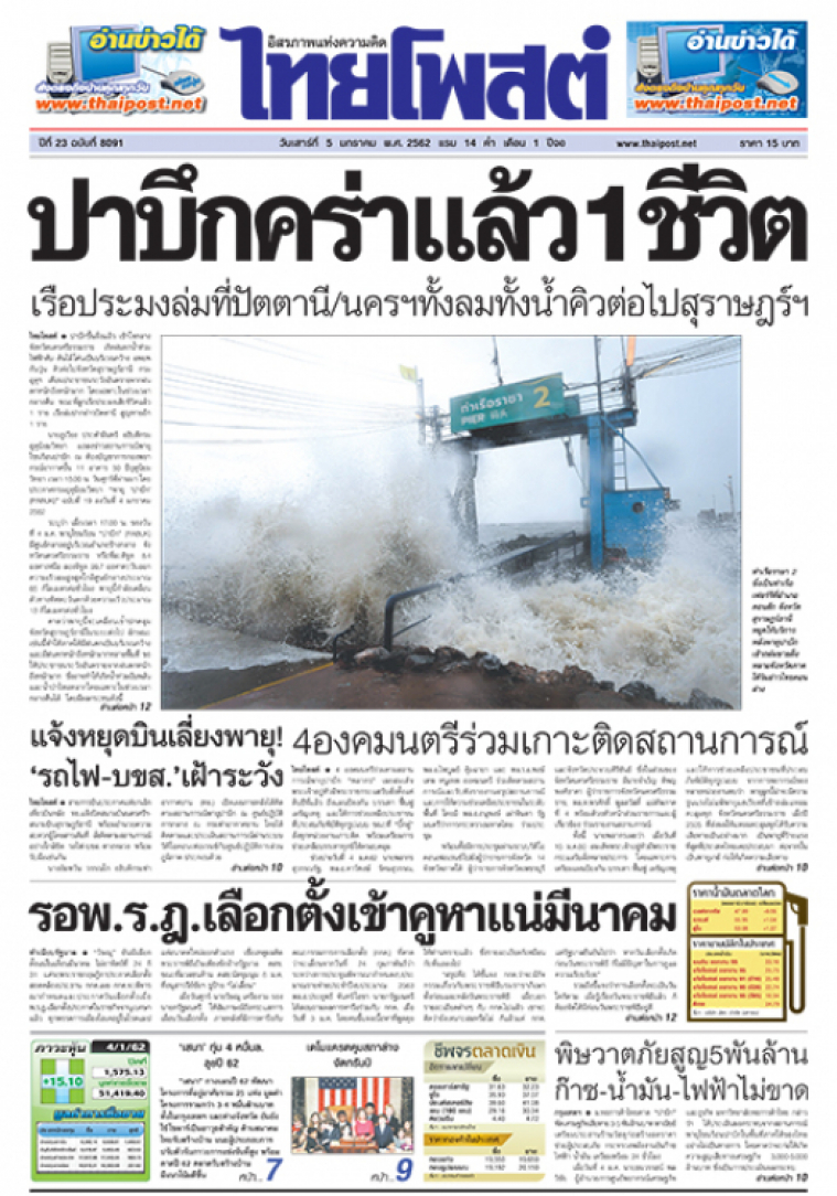 ปาบึกขึ้นฝั่งแล้ว เข้าใจกลางจังหวัดนครศรีธรรมราช เกิดฝนตกน้ำท่วม ไฟฟ้าดับ ต้นไม้โค่นเป็นบริเวณกว้าง อพยพกันวุ่น คิวต่อไปจังหวัดสุราษฎร์ธานี กรมอุตุฯ เตือนประชาชนระวังอันตรายจากฝนตกหนักถึงหนักมาก โดยเฉพาะในช่วงเวลากลางคืน ขณะที่ลูกเรือประมงเสียชีวิตแล้ว 1 ราย เรือล่มปากอ่าวปัตตานี สูญหายอีก 1 ราย
