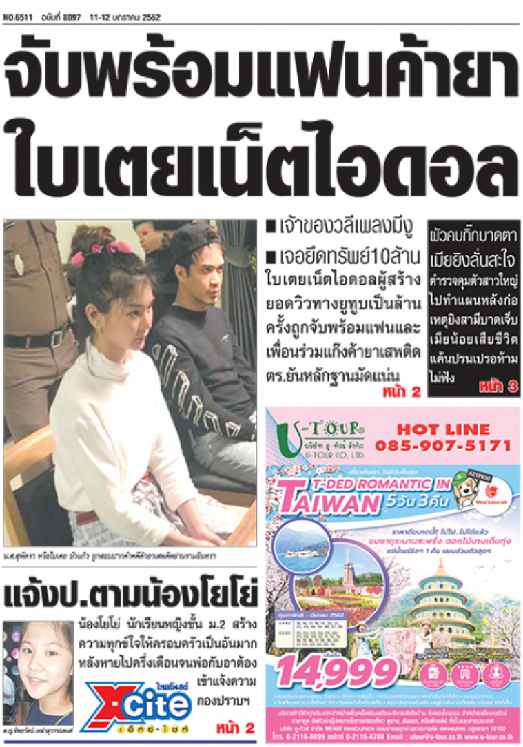 เจ้าของวลีเพลงมีงูเจอยึดทรัพย์10ล้านใบเตยเน็ตไอดอลผู้สร้างยอดวิวทางยูทูบเป็นล้าน ครั้งถูกจับพร้อมแฟนและเพื่อนร่วมแก๊งค้ายาเสพติด ตร.ยันหลักฐานมัดแน่น