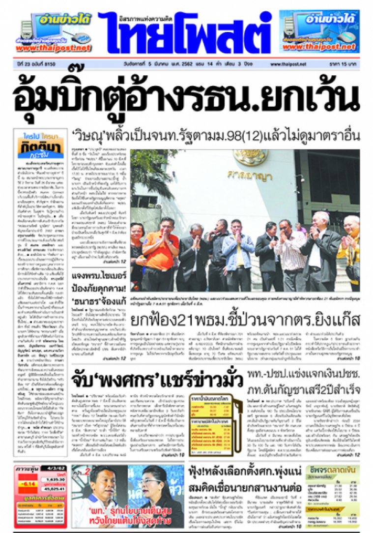 "ปรีชาพล" พร้อมน้อมรับคำตัดสินยุบพรรค ทษช. 7 มี.ค.นี้ บ่นเสียดายพยานไม่มีโอกาสชี้แจง ขอมวลชนอย่ามาศาล หวั่นถูกโยงสร้างเงื่อนไขเหตุรุนแรง "กกต." สั่งลบ 12 โพสต์ผิด กม.และรับคำร้องสอบพรรคอนาคตใหม่อุปโลกน์ประวัติ "ธนาธร" เรียก "ศรีสุวรรณ" ผู้ร้องไต่สวน 6 มี.ค.