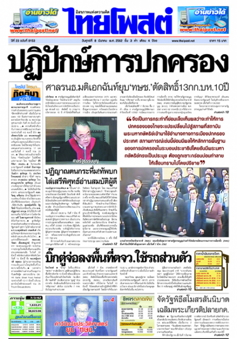 ศาลรัฐธรรมนูญมีมติเอกฉันท์วินิจฉัยยุบพรรค “ไทยรักษาชาติ” เหตุเป็นปรปักษ์ต่อระบอบการปกครองแบบประชาธิปไตยอันมีพระมหากษัตริย์ทรงเป็นประมุข พ่วงมติ 6:3 ตัดสิทธิ์ 13 กรรมการบริหารพรรค 10 ปี คำวินิจฉัยชี้ชัดตั้งแต่เปลี่ยนแปลงการปกครอง 2475 และพระราชหัตถเลขารัชกาล 7 สถาบันฯ อยู่เหนือการเมือง