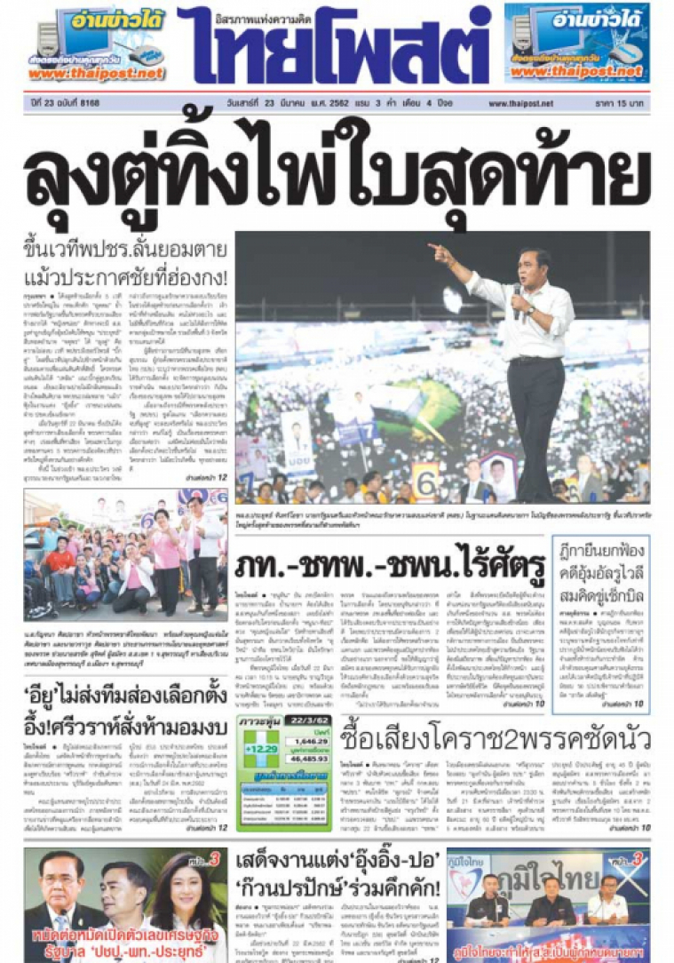 โค้งสุดท้ายเลือกตั้ง 5 เวทีปราศรัยใหญ่ใน กทม.คึกคัก "อุตตม" ย้ำการฟอร์มรัฐบาลขึ้นกับพรรคที่รวบรวมเสียงข้างมากได้ "หญิงหน่อย" ดักทางจะมี ส.ส.งูเห่าถูกเชิญกึ่งอุ้มบังคับให้หนุน "ประยุทธ์" สืบทอดอำนาจ "จตุพร" โต้ "ลุงตู่" คือความไม่สงบ เวทีพปชร.มีเซอร์ไพรส์ "บิ๊กตู่" โผล่ขึ้นเวทีปลุกเดินไปข้างหน้าด้วยกัน ลั่นยอมตายเพื่อแผ่นดินศักดิ์สิทธิ์ ใครทรยศแผ่นดินไม่ได้ "เหลิม" แนะบิ๊กตู่ดูบทเรียนถนอมเย้ยมะลิยามบ่ายไม่มีกลิ่นหอมแล้ว อ้างโพลสันติบาล พท.ชนะถล่มทลาย "แม้ว" ฟุ้งในงานแต่ง "อุ๊งอิ๊ง" เราชนะแน่นอน ฝ่าย ปชต.เข้มแข็งมาก