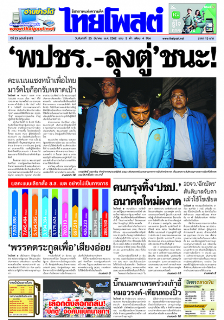 "พปชร." ผงาด! กวาด 7,503,898 คะแนน เฉือน "พท." ที่ได้ 7,045,494 คน "อนาคตใหม่" แรง 5,164,595 คะแนน คว้าอันดับ 3 เขี่ย "ปชป." ตกไปที่ 4 "อภิสิทธิ์" ประกาศลาออกจากหัวหน้าพรรค ลั่นต้องรักษาสัจจะนักการเมือง "กกต." แ ถลงยอดใช้สิทธิทั่วประเทศ 65.96% "บิ๊กตู่" ขอบคุณประชาชนคนไทย ย้ำอยู่ปฏิบัติหน้าที่จนได้รัฐบาลใหม่