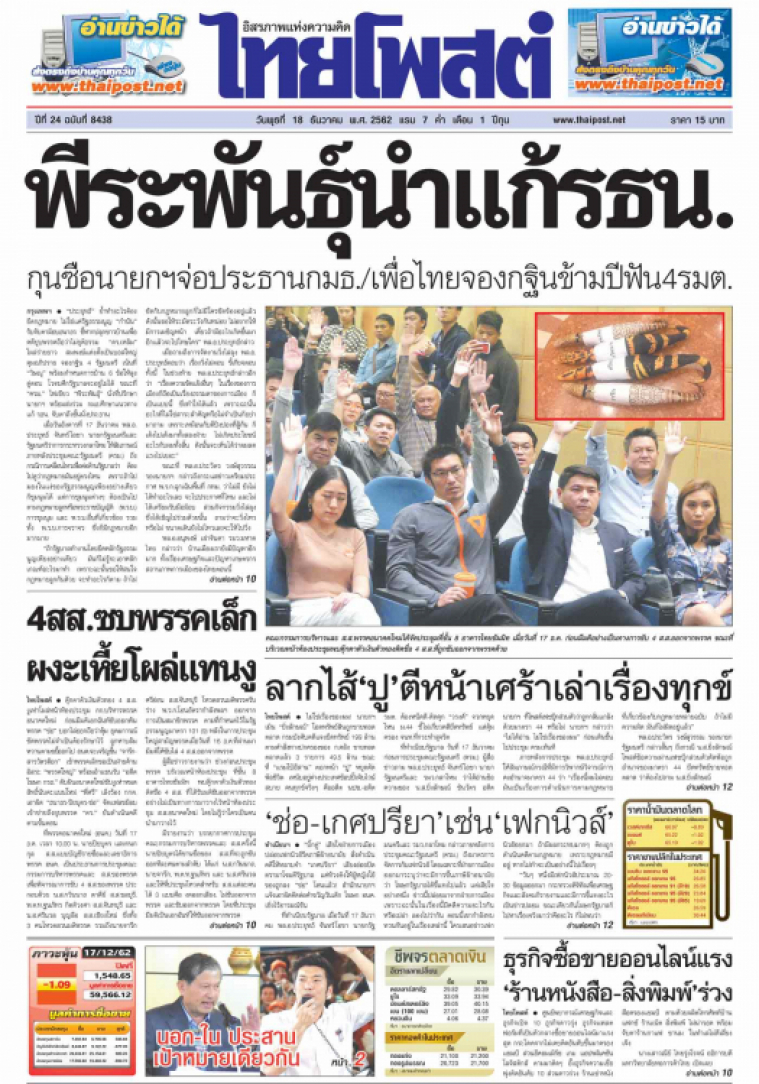 ตุ๊กตาตัวเงิน-ตัวทอง 4 ส.ส.งูเห่าโผล่หน้าห้องประชุม กก.บริหารพรรคอนาคตใหม่ ก่อนมีมติเอกฉันท์ขับออกพ้นพรรค "ช่อ" บอกไล่ออกถือว่าคุ้ม อุดมการณ์ขัดพรรคไม่จำเป็นต้องรักษาไว้ ลูกหาบส้มหวานตามขยี้ออกไป อนค.จะเจริญขึ้น "จารึก-สารวัตรต๊อก" เข้าพรรคเล็กขอเป็นฝ่ายค้านอิสระ "พรรคใหญ่" พร้อมอ้าแขนรับ "อดีตโฆษก กรธ." ดับฝันอนาคตใหม่ขับงูเห่าหมดสิทธิ์นับคะแนนใหม่ "พี่ศรี" เล็งร้อง กกต.เอาผิด "ธนาธร-ปิยบุตร-ช่อ" จัดแฟลชม็อบเข้าข่ายถึงยุบพรรค "ตร." ยันดำเนินคดีตามขั้นตอน