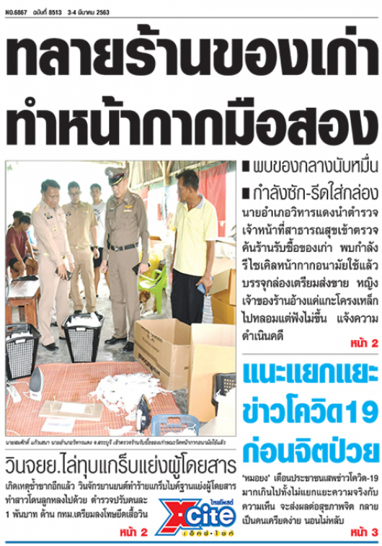 พบของกลางนับหมื่นกำลังซัก-รีดใส่กล่องนายอำเภอวิหารแดงนำตำรวจ เจ้าหน้าที่สาธารณสุขเข้าตรวจค้นร้านรับซื้อของเก่า พบกำลังรีไซเคิลหน้ากากอนามัยใช้แล้ว บรรจุกล่องเตรียมส่งขาย หญิงเจ้าของร้านอ้างแค่แกะโครงเหล็กไปหลอมแต่ฟังไม่ขึ้น แจ้งความดำเนินคดี