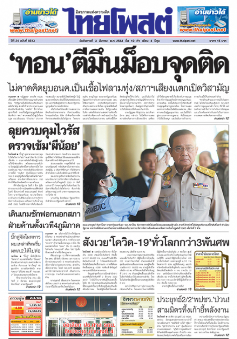 "บิ๊กตู่" ลุยหามาตรการควบคุมไวรัสโควิด-19 "สธ." พบสาวไทยวัย 22 ติดเชื้อเพิ่ม 1 รายจากสัมผัสใกล้ชิดผู้ป่วยขับรถให้นักท่องเที่ยว พร้อมขยายเกณฑ์เฝ้าระวังกลุ่มผู้ป่วยติดเชื้อทางเดินหายใจ-โรคปอดอักเสบ "ตม." ตรวจเข้มผีน้อยกลับจากเกาหลีใต้ "อนุทิน" ยันยังไม่ประกาศเป็นระยะ 3 ถกอุปทูตจีนขอซื้อยาสกัดโควิด "มท." เตรียมชง ครม.อังคารนี้ของบกลาง 250 ล้านให้ท้องถิ่นผลิตหน้ากากอนามัยเอง