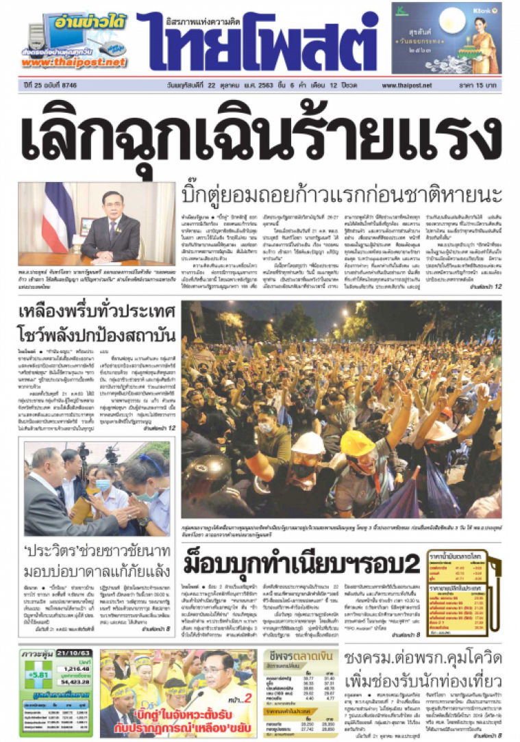 ม็อบ 2 ฝ่ายเริ่มเผชิญหน้า กลุ่มคณะราษฎรตั้งหลักที่อนุสาวรีย์ชัยฯ เดินเท้าไปทำเนียบรัฐบาล "ทนายนกเขา" ฉายเดี่ยวขวางทางที่แยกพญาไท ลั่น "ถ้าละเมิดสถาบันผมไม่ให้ผ่าน" ก่อนเกิดชุลมุน พร้อมฝ่าด่าน ตร.ประชิดทำเนียบฯ ม.รามฯ เดือด!กลุ่มอาชีวะช่วยชาติตั้งเวทีไล่กลุ่ม 3 นิ้วไม่ให้เข้าจัดกิจกรรม ศาลแพ่งนัดฟังคำสั่งคดีเพิกถอนประกาศฉุกเฉินร้ายแรง 22 ต.ค.นี้ ขณะที่ศาลอาญายกเลิกคำสั่งปิด "วอยซ์ทีวี-สื่อออนไลน์-เยาวชนปลดแอก" ชี้ รธน.รับรองเสรีภาพ-คำร้องไม่ชัดเจน