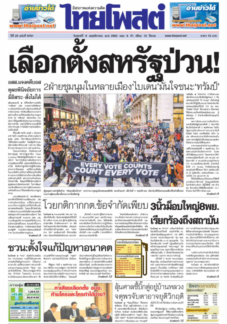 ไม่จบง่ายๆ การนับคะแนนเลือกตั้งประธานาธิบดีสหรัฐผ่านมา 2 คืนแล้วยังสรุปไม่ได้ "โจ ไบเดน" มั่นใจเป็นผู้ชนะหลังได้รัฐมิชิแกนและวิสคอนซินเพิ่มยอดคณะผู้เลือกตั้งใกล้ 270 คน ขณะ "โดนัลด์ ทรัมป์" ดิ้นรนทุกทาง ยื่นศาลขอให้นับคะแนนใหม่หรือหยุดนับคะแนน ผู้สนับสนุน 2 ฝ่ายเริ่มเคลื่อนไหวชุมนุมในหลายเมือง