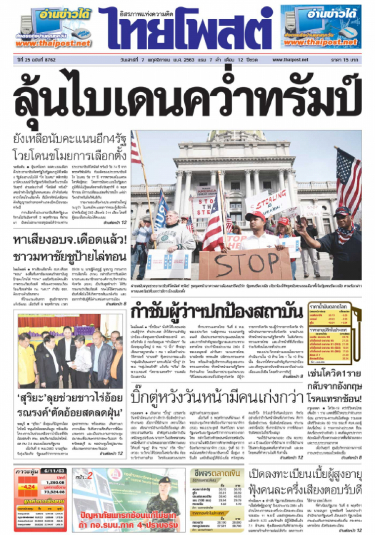 ลุ้นเหงื่อตก ผลคะแนนเลือกตั้งประธานาธิบดีสหรัฐในรัฐสมรภูมิที่เหลือ 4 รัฐยังเอาแน่ไม่ได้ "โจ ไบเดน" พลิกกลับมามีคะแนนนำในรัฐจอร์เจียเป็นครั้งแรกเมื่อวันศุกร์ ส่วนช่องว่างที่ "โดนัลด์ ทรัมป์" เคยนำห่างในรัฐอื่นหดแคบลง เจ้าตัวยังพ่นคาถาโดนโกงเลือกตั้ง สื่อโทรทัศน์เหลือทนตัดสัญญาณถ่ายทอดคำแถลงบิดเบือนของทรัมป์