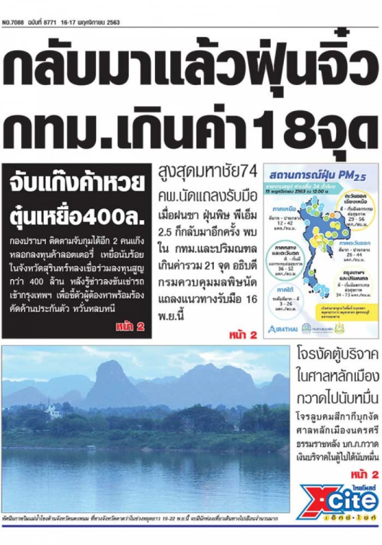 มันกลับมาแล้ว ฝุ่นจิ๋ว พีเอ็ม 2.5 ท่วม กทม.และปริมณฑล 21 พื้นที่ สูงสุดที่มหาชัย 74 ไมโครกรัม อธิบดีกรมควบคุมมลพิษนัดแถลง 16 พ.ย. จะรับมือยังไง ด้านนักท่องเที่ยวยังแห่ไปสัมผัสไอเย็นในภาคเหนือ อีสาน กิ่วแม่ปานอุณหภูมิลดเหลือ 5 องศา
