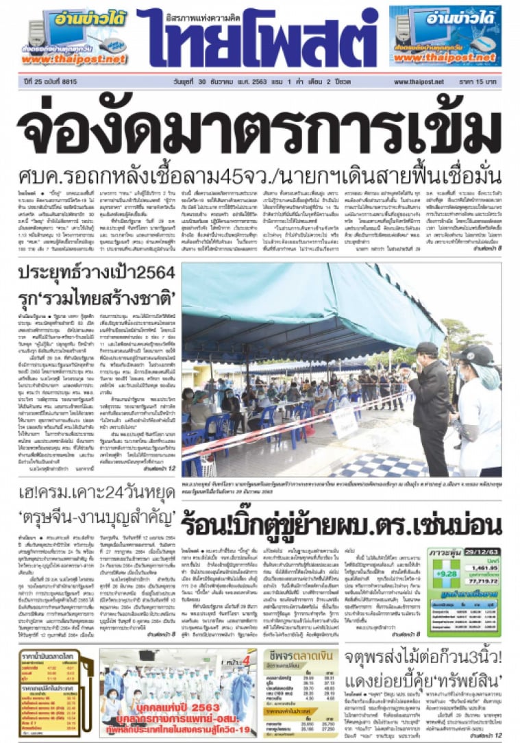 "บิ๊กตู่" ยกคณะลงพื้นที่ จ.ระยอง ติดตามสถานการณ์โควิด-19 ไม่ห้าม ปชช.กลับบ้านปีใหม่ ขอยึดนิวนอร์มอลเคร่งครัด เตรียมเดินสายไปพัทยาอีก 30 ธ.ค.นี้ "วิษณุ" ย้ำยังไม่ล็อกดาวน์ รอประเมินผลหลังหยุดยาว "ครม." เคาะใช้เงินกู้ 1.13 หมื่นล้านหนุน 10 โครงการสาธารณสุข "ศบค." เผยพบผู้ติดเชื้อรายใหม่ยังสูง 155 ราย เล็ง 7 วันยอดไม่ลดชงยกระดับมาตรการ "กทม." แจ้งผู้ใช้บริการ 2 ร้านอาหารย่านปิ่นเกล้ารีบไปพบแพทย์ "ผู้ว่าฯ สมุทรสาคร" อาการดีขึ้น หลายจังหวัดเริ่มคุมเข้มหลังพบผู้ติดเชื้อเพิ่ม