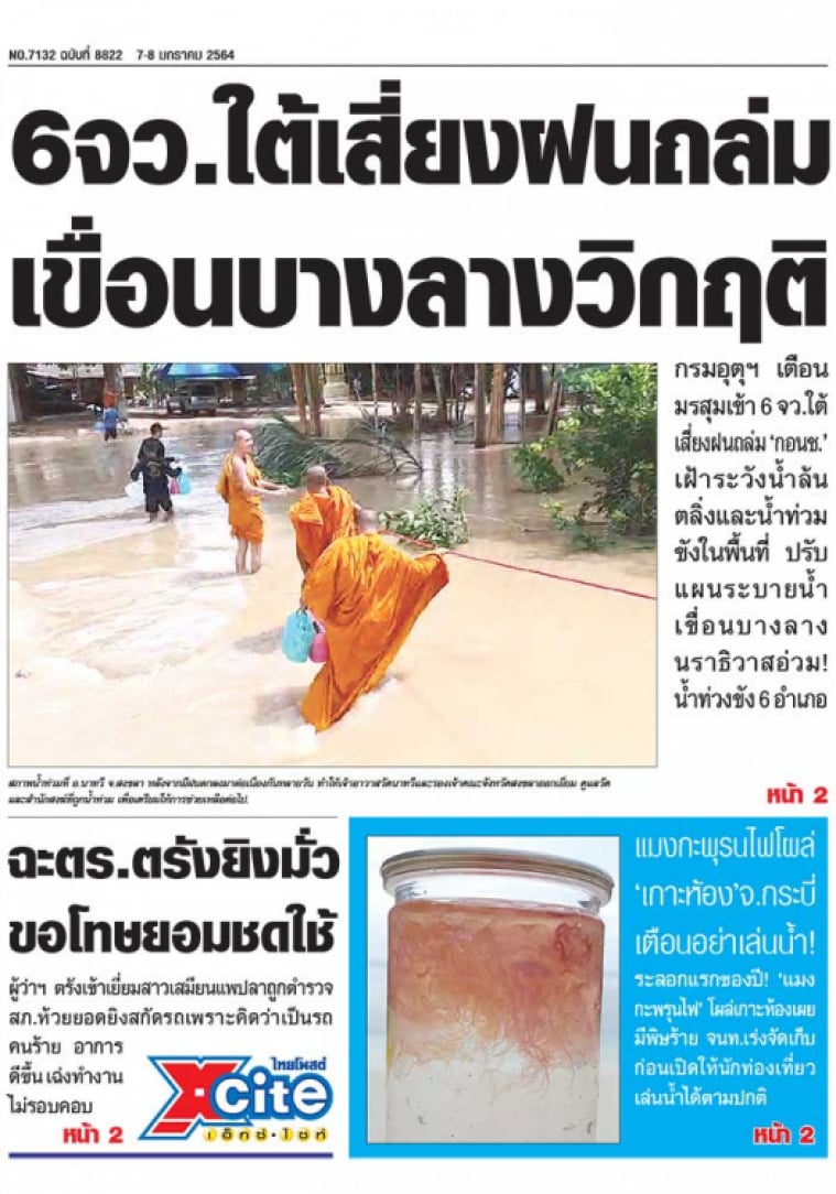 กรมอุตุฯ เตือนมรสุมเข้า 6 จังหวัดใต้เสี่ยงฝนถล่ม "กอนช." เฝ้าระวังน้ำล้นตลิ่งและน้ำท่วมขังในพื้นที่ภาคใต้ พร้อมเตรียมปรับแผนการระบายน้ำเขื่อนบางลาง หลังคาดการณ์ฝนตกหนักต่อเนื่องไหลลงอ่างเก็บน้ำเพิ่มขึ้น นราธิวาสอ่วม! น้ำท่วมขัง 6 อำเภอ