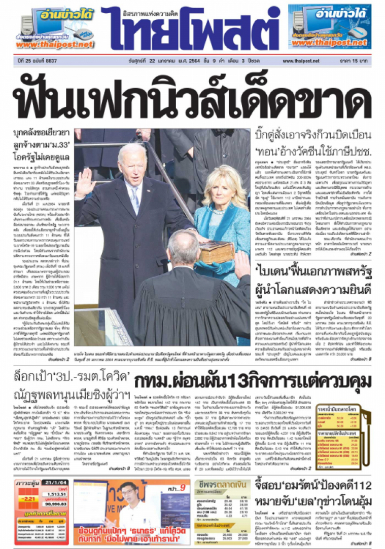 ผ่านพ้นอย่างราบรื่น "โจ ไบเดน" สาบานตนเป็นประธานาธิบดีคนที่ 46 ของสหรัฐในพิธีแบบนิวนอร์มอล ท่ามกลางการรักษาความปลอดภัยอย่างแน่นหนาที่สุด โดยไร้เงา "โดนัลด์ ทรัมป์" กล่าวสุนทรพจน์รับตำแหน่งเรียกร้องความเป็นเอกภาพและเยียวยาประเทศ เริ่มงานแรกด้วยการลงนามคำสั่งแก้ไขนโยบายที่สร้างความแตกแยกของทรัมป์ ผู้นำทั่วโลกแสดงความยินดีต่อไบเดนกันอย่างอุ่นหนาฝาคั่ง ขณะที่ "ประยุทธ์" เชิญไบเดนและสุภาพสตรีหมายเลขหนึ่งเยือนกรุงเทพฯ