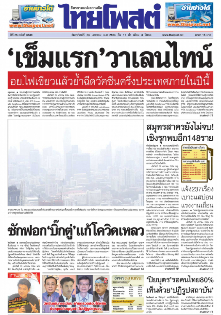 ประธานผู้ตรวจการแผ่นดินยันการจัดซื้อวัคซีนโควิด-19 ของรัฐบาลทำเต็มที่-รอบคอบ เตรียมฉีดวัคซีนเข็มแรก 14 ก.พ.นี้ ได้วัคซีนแล้ว 2 แหล่ง จาก Sinovac และ AstraZeneca ยันในสภาวการณ์ระบาดฉุกเฉินทั่วโลก รัฐจะเป็นผู้บริหารจัดการวัคซีน ยังไม่สามารถให้เอกชนจัดซื้อได้โดยตรง รองเลขาธิการ อย.เผยอนุมัติวัคซีนแล้ว 2 บริษัท โฆษกรัฐบาลเผยนายกฯ มีนโยบายฉีดให้ประชาชน 50% ภายในปีนี้