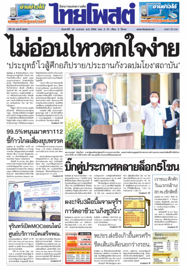 ศบค.เคาะคลายล็อก 1 ก.พ. ผ่อนปรนหนักเบาตาม 5 โซนโควิด หลายพื้นที่นั่งกิน-ดื่มสุรา-เที่ยวอาบอบนวดได้ ชี้ถ้ายอดติดเชื้อพุ่งมาตรการเปลี่ยนได้ทันที "บิ๊กตู่" หวัง ปชช.ใช้ชีวิตได้ปกติ ย้ำยังต้องตั้งการ์ดสูง เตือนผู้ประกอบการหละหลวมเจอสั่งปิดแน่ พร้อมลงมือช่วยเรื่องวัคซีนเองสัปดาห์หน้า ตร.รับลูกนายกฯ เอาผิดผู้ป่วยที่ปกปิดไทม์ไลน์ สธ.แจงเคสมะตูมลาม 29ราย แพทย์เผยผู้ว่าฯ สมุทรสาครอาการดีขึ้น