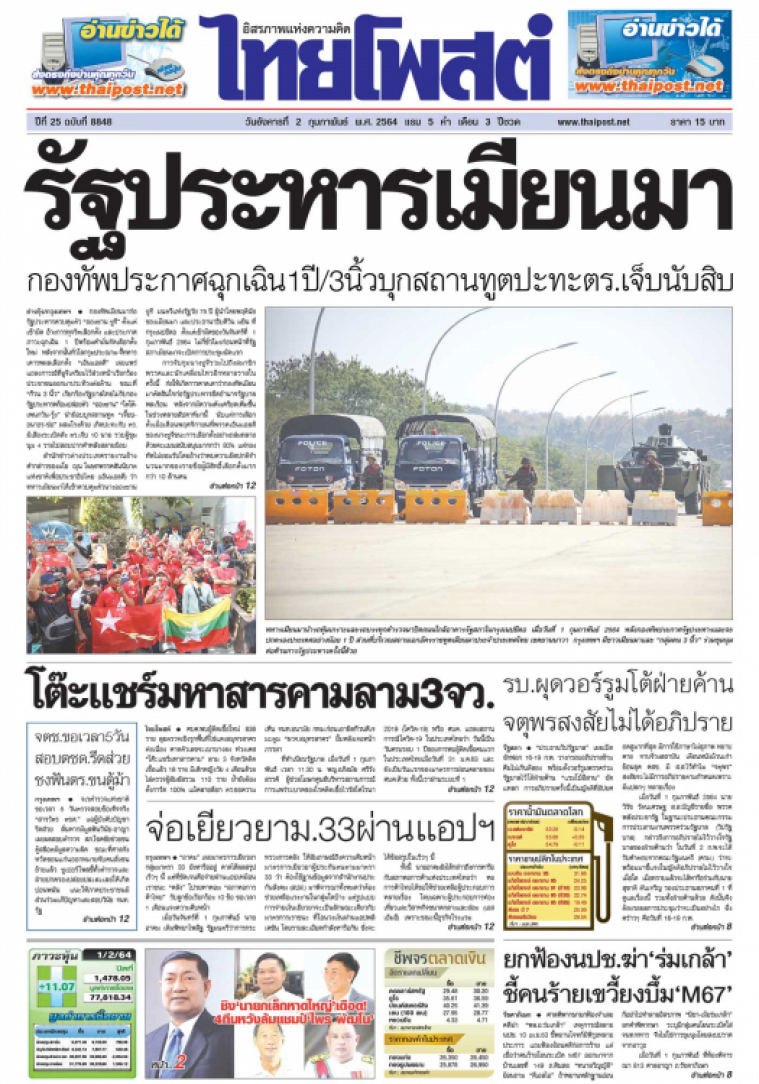กองทัพเมียนมาก่อรัฐประหารควบคุมตัว "อองซาน ซูจี" ตั้งแต่เช้ามืด อ้างการทุจริตเลือกตั้ง และประกาศภาวะฉุกเฉิน 1 ปีพร้อมคำมั่นจัดเลือกตั้งใหม่ หลังจากนั้นทั่วโลกรุมประณาม-จี้ทหารเคารพผลเลือกตั้ง "เอ็นแอลดี" เผยแพร่แถลงการณ์ที่ซูจีเตรียมไว้ล่วงหน้าเรียกร้องประชาชนออกมาประท้วงต่อต้าน ขณะที่ "ก๊วน 3 นิ้ว"