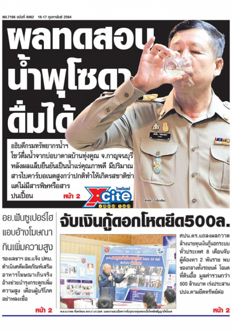อธิบดีกรมทรัพยากรน้ำฯ โชว์ดื่มน้ำจากบ่อบาดาลบ้านทุ่งคูณ จ.กาญจนบุรีหลังผลแล็บยืนยันเป็นน้ำแร่คุณภาพดี มีปริมาณสารไบคาร์บอเนตสูงกว่าปกติทำให้เกิดรสชาติซ่าแต่ไม่มีสารพิษหรือสารปนเปื้อน