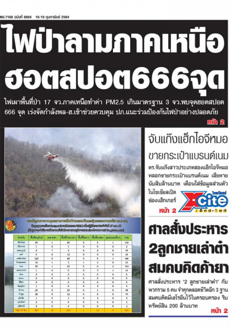 ไฟเผาพื้นที่ป่า 17 จว.ภาคเหนือทำค่า PM2.5 เกินมาตรฐาน 3 จว.พบจุดฮอตสปอต 666 จุด เร่งจัดกำลังพล-ฮ.เข้าช่วยควบคุม ปภ.แนะร่วมป้องกันไฟป่าอย่างปลอดภัย