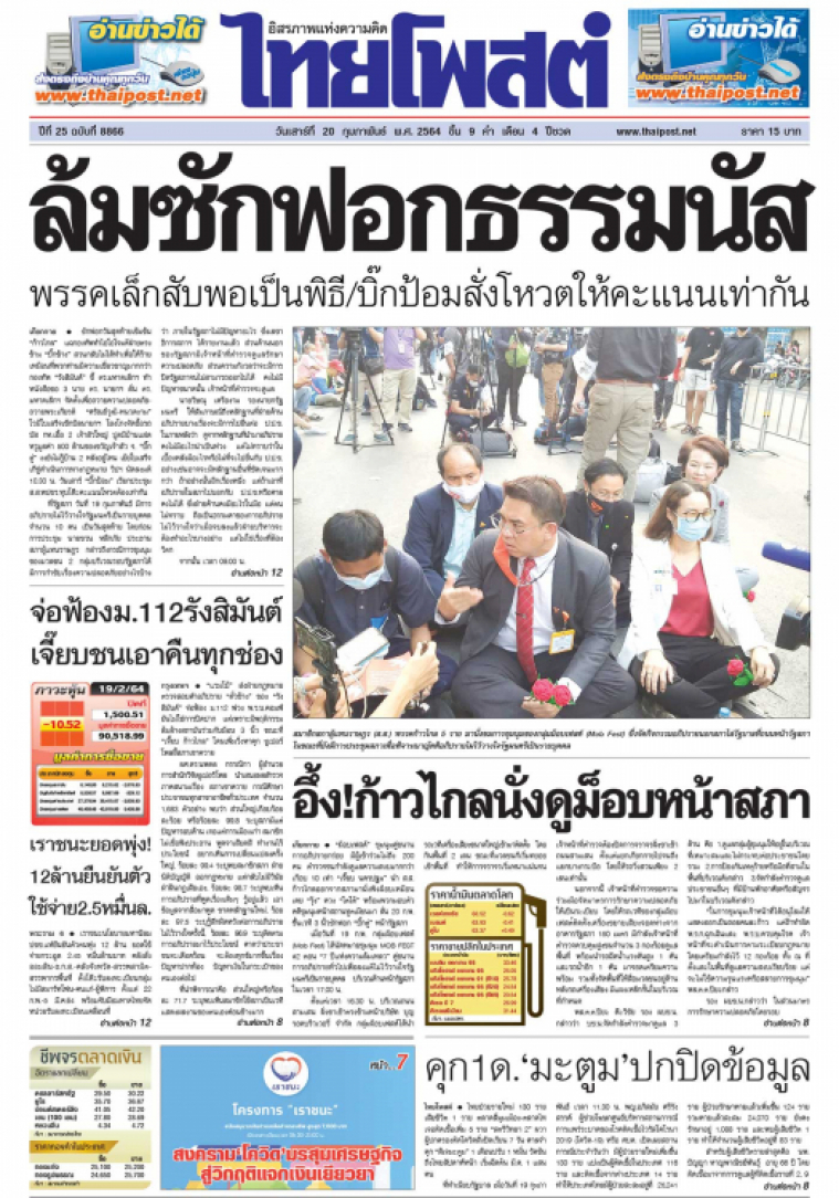"ม็อบเฟสต์" ชุมนุมคู่ขนานการอภิปรายกร่อย มีผู้เข้าร่วมไม่ถึง 200 คน ตำรวจขนกำลังดูแลความสงบมากกว่าเกือบ 10 เท่า "เจี๊ยบ นครปฐม" นำ ส.ส.ก้าวไกลออกจากสภามานั่งฟังม็อบเหมือนเคย "รุ้ง" ควง "โตโต้" พร้อมพวกมอบตัวคดีชุมนุมหน้าสถานทูตเมียนมา ลั่น 20 ก.พ.ขึ้นเวที 3 นิ้วซักฟอก "บิ๊กตู่" หน้ารัฐสภา