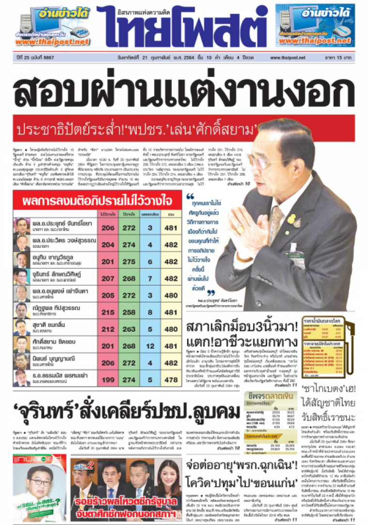 โหวตญัตติอภิปรายไม่ไว้วางใจ 10 รัฐมนตรี ผ่านหมด ส.ส.ไม่แตกแถวลงมติโหวต "บิ๊กตู่" ส่วน "บิ๊กป้อม" ยังปึ้ก ส.ส.รัฐบาลหนุนเข้มแข็ง ด้าน 5 งูเห่าฝ่ายค้านหนุน "อนุทิน" คะแนนพุ่งสูงสุด ประชาธิปัตย์ระส่ำ 3 คู่กัดงดออกเสียง "จุรินทร์" "ครูตั้น" เจอพิษพรรคเล็กได้คะแนนน้อยสุด ด้าน 6 ดาวฤกษ์ พปชร.งดออกเสียง "ศักดิ์สยาม" เพื่อชาติยกพรรคช่วย "ธรรมนัส" สำหรับ "พิธา" มาแปลก โหวตไม่ลงคะแนน "ธรรมนัส"