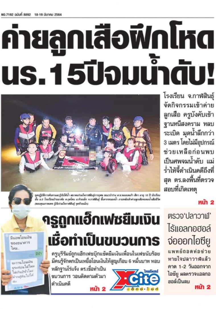 สลด! เด็กนักเรียน ม.3 วัย 15 ปีจมน้ำตายคาค่ายลูกเสือ เผยโรงเรียนจัดกิจกรรมเข้าค่ายฝึกสุดโหด ครูบังคับเข้าฐานหนีสงคราม หลบระเบิด มุดน้ำความลึกกว่า 3 เมตร โดยไม่มีอุปกรณ์เตรียมไว้ช่วยเหลือ ก่อนพบเป็นศพจมน้ำดับ แม่โวยบังคับลูกลงน้ำทั้งที่ว่ายน้ำไม่เป็น จี้ดำเนินคดีอย่างถึงที่สุด ตร.ลงตรวจสอบที่เกิดเหตุ เรียกผู้เกี่ยวข้องมาสอบปากคำ
