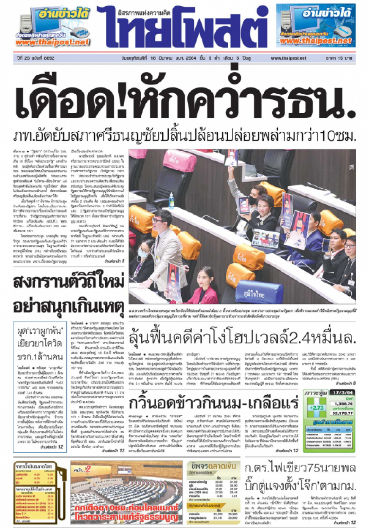 นายกฯ ขอบคุณ อสม.ร่วมสร้างประวัติศาสตร์ดูแลสุขภาพคนไทย โอดเจอดรามาฉีดวัคซีนปลอม ฟุ้งหลังโควิดผ่อนคลายไทยมีโอกาสก้าวเป็นประเทศมีรายได้สูง "คกก.เฉพาะกิจฯ" เคาะจัดสงกรานต์วิถีใหม่ ห้ามสาดน้ำ-ประแป้ง-ปาร์ตี้โฟม เสนอศบค.ชุดใหญ่ 19 มี.ค.นี้ พร้อมลดระดับเข้มงวดสมุทรสาครจากสีแดงเป็นส้ม พบติดเชื้อรายวันอีก 248 ราย กทม.พุ่ง 167 ราย