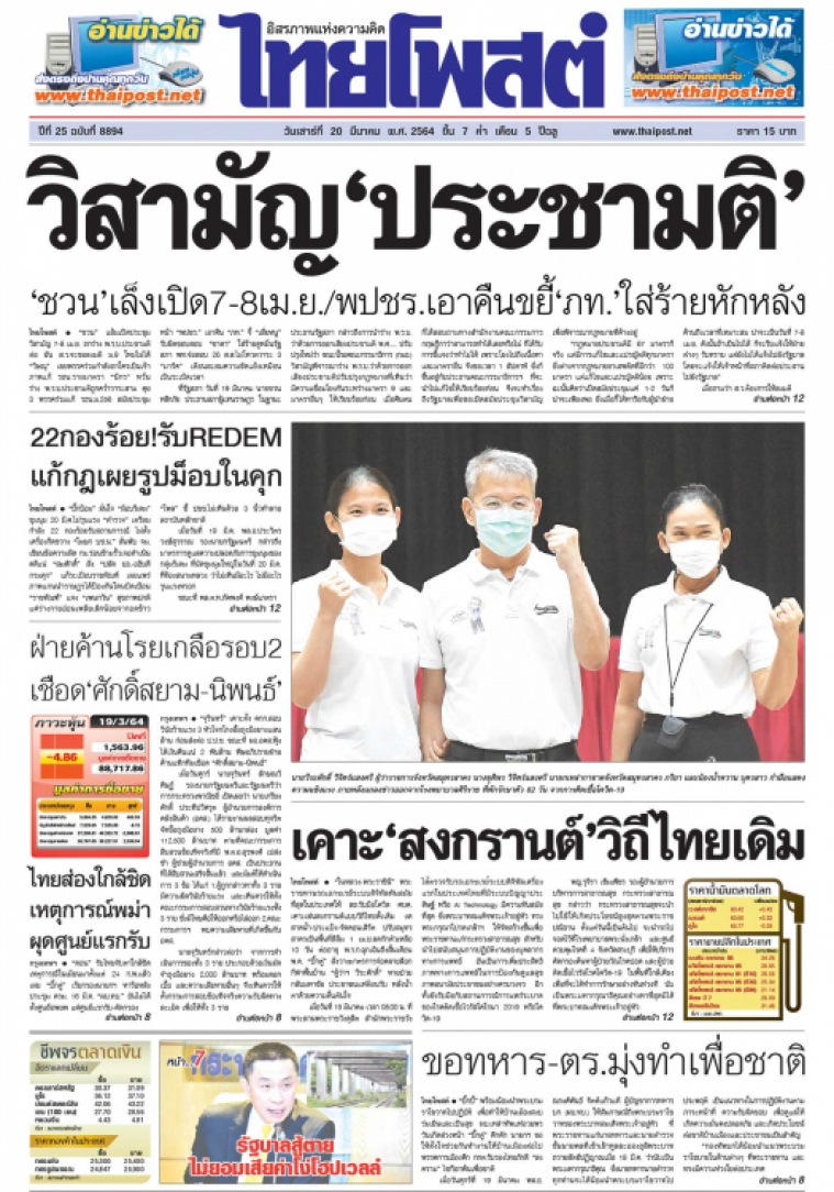 "ในหลวง-พระราชินี" พระราชทานรถเอกซเรย์ระบบดิจิทัลทันสมัยที่สุดในประเทศให้ สธ.รับมือโควิด ศบค.เคาะเล่นสงกรานต์แบบวิถีไทยดั้งเดิม งดสาดน้ำ-ประแป้ง-จัดคอนเสิร์ต ปรับสมุทรสาครเป็นพื้นที่สีส้ม 1 เม.ย.ลดกักตัวเหลือ 10 วัน ต่ออายุ พ.ร.ก.ฉุกเฉินถึงสิ้นเดือน พ.ค. "บิ๊กตู่" สั่งวางมาตรการจ่อคลายล็อกกีฬาพื้นบ้าน "ผู้ว่าฯ วีระศักดิ์" หายป่วยกลับมหาชัย ประชาชนแห่ต้อนรับ หลั่งน้ำตาด้วยความตื้นตันใจ