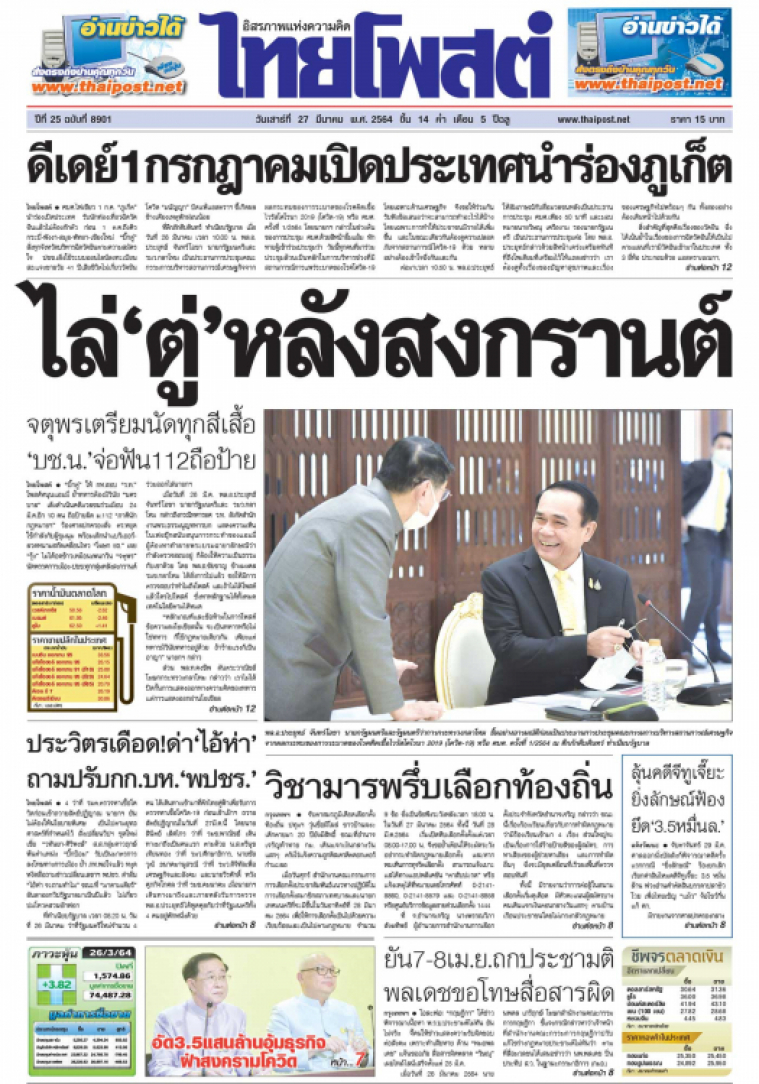 ศบศ.ไฟเขียว 1 ก.ค. "ภูเก็ต" นำร่องเปิดประเทศ รับนักท่องเที่ยวฉีดวัคซีนแล้วไม่ต้องกักตัว ก่อน 1 ต.ค.ถึงคิวกระบี่-พังงา-สมุย-พัทยา-เชียงใหม่ “บิ๊กตู่” สั่งทุกจังหวัดบริหารฉีดวัคซีนตามความสมัครใจ ปชช.เล็งใช้ระบบออนไลน์ลงทะเบียน สธ.แจงชายวัย 41 ปีเสียชีวิตไม่เกี่ยววัคซีนโควิด "มนัญญา" ปัดแพ้แอสตราฯ ชี้เกิดผลข้างเคียงเหตุพักผ่อนน้อย