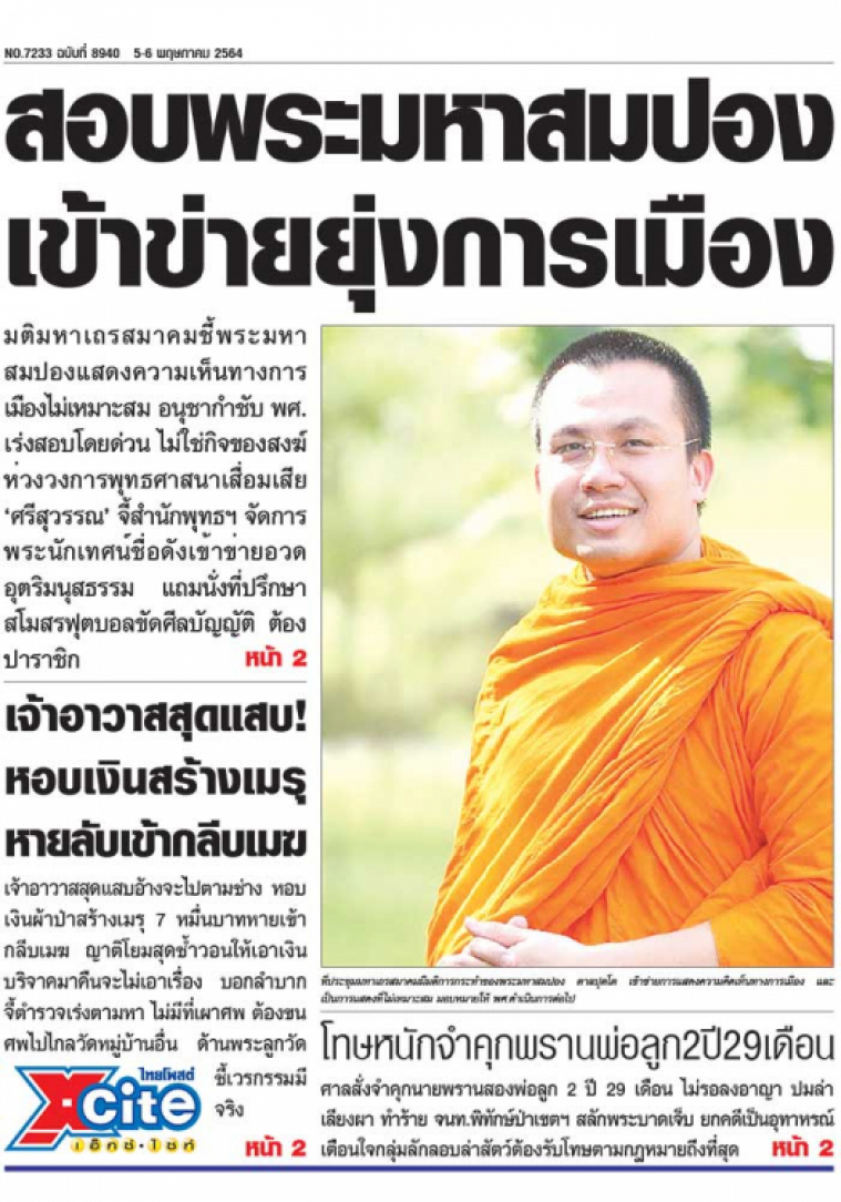 มติมหาเถรสมาคมชี้พระมหาสมปองแสดงความเห็นทางการเมืองไม่เหมาะสม อนุชากำชับ พศ.เร่งสอบโดยด่วน ไม่ใช่กิจของสงฆ์ ห่วงวงการพุทธศาสนาเสื่อมเสีย 'ศรีสุวรรณ' จี้สำนักพุทธฯ จัดการพระนักเทศน์ชื่อดังเข้าข่ายอวดอุตริมนุสธรรม แถมนั่งที่ปรึกษาสโมสรฟุตบอลขัดศีลบัญญัติ ต้องปาราชิก