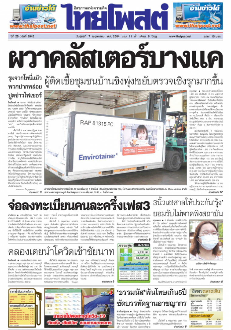 กรมสมเด็จพระเทพฯ พระราชทาน Oxygen high flow แก่ รพ.ชลบุรี สมุทรปราการติดเชื้อยังพุ่ง 143 ราย เสียชีวิตเพิ่ม 3 ราย แม่ค้าคลองเตยนำโควิดเข้าชัยนาท โดนดำเนินคดีหนีกลับไม่ขออนุญาต ปัตตานีเข้มด่านโควิดใกล้ฮารีรายอมาจากมาเลย์กักตัวทุกคน เมืองคอนผวาคลัสเตอร์ใหม่เรือนจำปากพนัง-ชะอวด