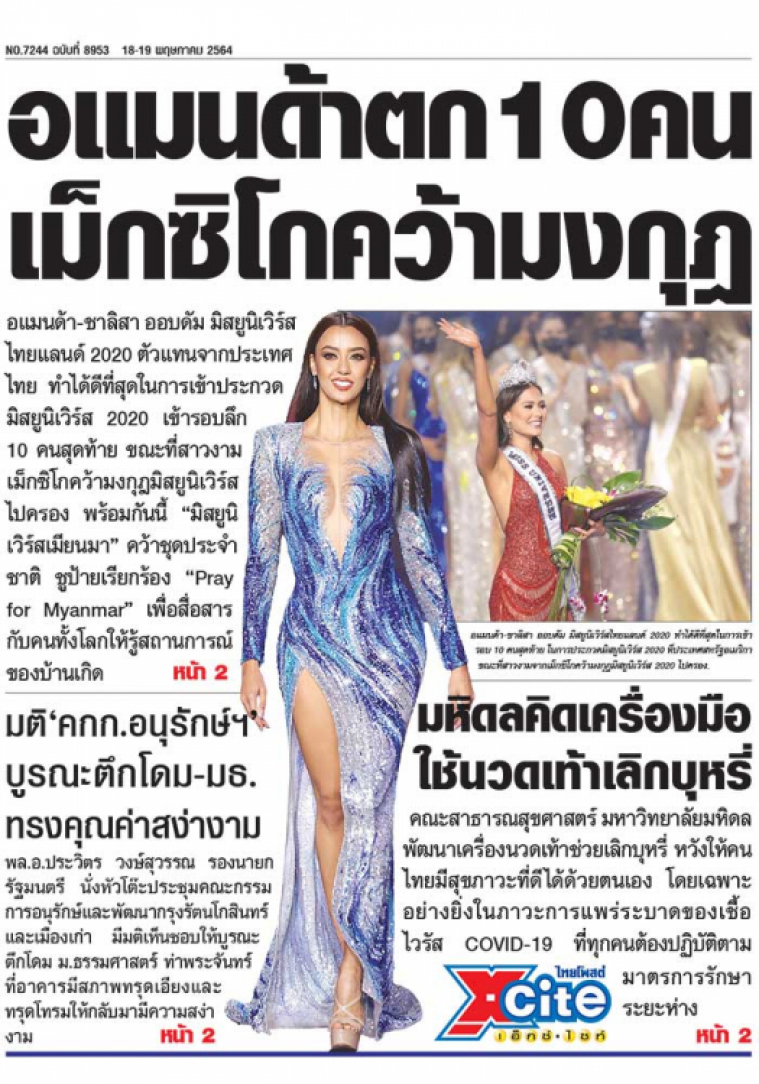อแมนด้า-ชาลิสา ออบดัม มิสยูนิเวิร์สไทยแลนด์ 2020 ตัวแทนจากประเทศไทย ทำได้ดีที่สุดในการเข้าประกวดมิสยูนิเวิร์ส 2020 เข้ารอบลึก 10 คนสุดท้าย ขณะที่สาวงามเม็กซิโก คว้ามงกุฎมิสยูนิเวิร์สไปครอง พร้อมกันนี้ “มิสยูนิเวิร์สเมียนมา” คว้าชุดประจำชาติ ชูป้ายเรียกร้อง “Pray for Myanmar” เพื่อสื่อสารกับคนทั้งโลกให้รู้สถานการณ์ของบ้านเกิด