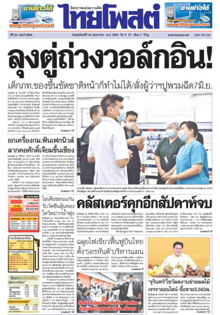 กรมสมเด็จพระเทพฯ พระราชทานเครื่อง Oxygen High Flow แก่โรงพยาบาลอ่างทอง เพื่อใช้รักษาผู้ป่วยโควิด สมุทรปราการยังพุ่งอีก 153 ราย เสียชีวิตเพิ่ม 5 คน สงขลาติดเชื้อ 46 ราย ปิดตลาดสดหาดใหญ่ 3 วัน ขอนแก่นจัดเต็มฉีดวัคซีนลุ้นทอง! แจกคูปองส่วนลดร้านค้าเพียบ