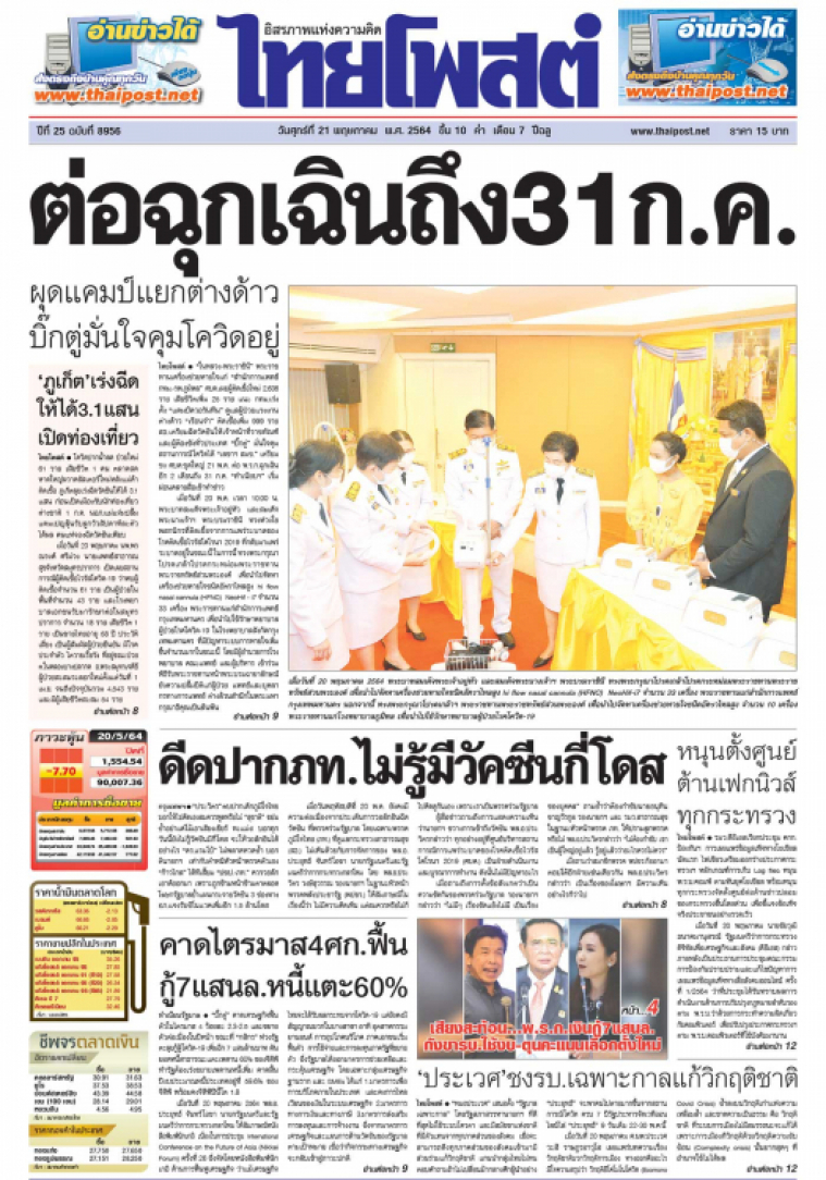 "ในหลวง-พระราชินี" พระราชทานเครื่องช่วยหายใจแก่ "สำนักการแพทย์ กทม.-รพ.ภูมิพล" ศบค.เผยผู้ติดเชื้อใหม่ 2,636 ราย เสียชีวิตเพิ่ม 25 ราย แนะ กทม.เร่งตั้ง "แคมป์ควอรันทีน" ดูแลผู้ป่วยแรงงานต่างด้าว "เรือนจำ" ติดเชื้อเพิ่ม 999 ราย สธ.เตรียมฉีดวัคซีนให้เจ้าหน้าที่ราชทัณฑ์และผู้ต้องขังทั่วประเทศ "บิ๊กตู่" มั่นใจคุมสถานการณ์โควิดได้ "เลขาฯ สมช." เตรียมชง ศบค.ชุดใหญ่ 21 พ.ค. ต่อ พ.ร.ก.ฉุกเฉินอีก 2 เดือนถึง 31 ก.ค. "ทำเนียบฯ" เริ่มผ่อนคลายสื่อเข้าทำข่าว
