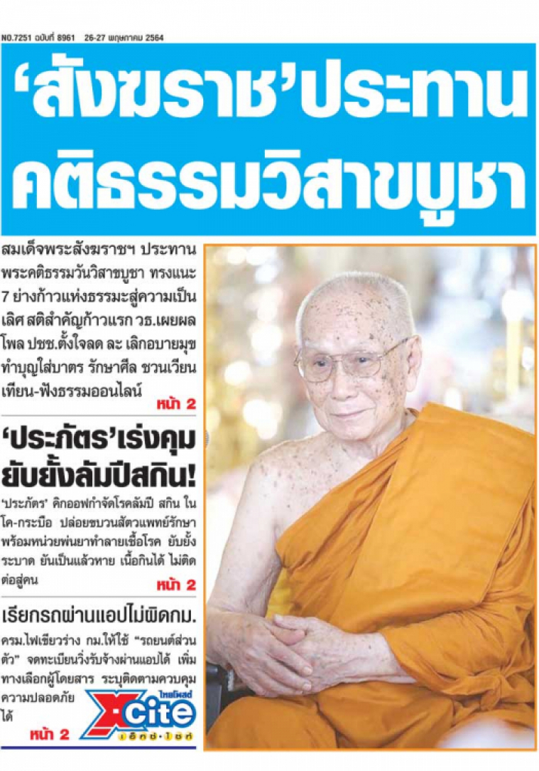 สมเด็จพระสังฆราชฯ ประทานพระคติธรรมวันวิสาขบูชา ทรงแนะ 7 ย่างก้าวแห่งธรรมะสู่ความเป็นเลิศ สติสำคัญก้าวแรก วธ.เผยผลโพล ปชช.ตั้งใจลด ละ เลิกอบายมุข ทำบุญใส่บาตร รักษาศีล ไม่ว่าร้ายคนอื่น แนะสืบสาน “วันอัฏฐมีบูชา” ชวนเวียนเทียนออนไลน์ ฟังธรรมะเดลิเวอรีผ่านแอป "อยู่บ้าน สร้างบุญ"