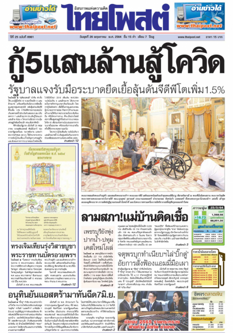 ไทยพบผู้ติดเชื้อใหม่อีก 3,226 ราย เสียชีวิตเพิ่ม 26 ราย ทำยอดรวมดับแล้ว 738 คน ศบค.แก้ปัญหาลักลอบเข้าเมือง เปิดด่านสระแก้ว 5 วันแทน รับผวา! กลุ่มอาชีพที่ต้องเคลื่อนย้ายประกอบการใน 6 จังหวัด กทม.ชงสกัดปัญหาแคมป์คนงาน เตรียมตรวจเชิงรุก 409 แคมป์ใน 50 เขต "หมอเบิร์ท" ชี้คลัสเตอร์บ้านบางแคเพราะผู้สูงอายุไปมาหาสู่กัน “ชวน” ยันต้องประชุมสภาตามรัฐธรรมนูญ เปิด-ปิดตามอำเภอใจไม่ได้ รับหมดสิทธิ์ประชุมรัฐสภาเพราะจำนวนเยอะเกิน งานเข้าอีก! แม่บ้านสภาติดเชื้อแต่ไปเข้าคิวฉีดวัคซีน