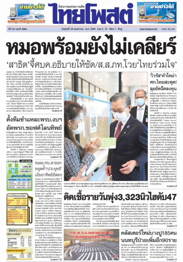 "ในหลวง" พระราชทานทรัพย์ 48 ล้าน จัดหาอุปกรณ์ทางการแพทย์ให้แก่กรมราชทัณฑ์ ดูแลผู้ต้องขังติดโควิด "ศบค." เผยติดเชื้อรายวัน 3,323 ราย เสียชีวิตเป็นนิวไฮ 47 ราย พบคลัสเตอร์ใหม่โรงงานแปรรูปอาหารสมุทรปราการป่วยใหม่ 116 ราย "ทำเนียบฯ" ป่วน จนท.แลกบัตรใต้ตึกบัญชาการติดโควิด "เรือนจำ" ยอดติดโควิดยังพุ่ง "กมธ.สธ." หนุนฟ้าทะลายโจรคู่ฟาวิพิราเวียร์ จ่อเชิญกรมการแพทย์แผนไทยฯ-อภัยภูเบศร หารือต่อยอดฝ่าวิกฤติ