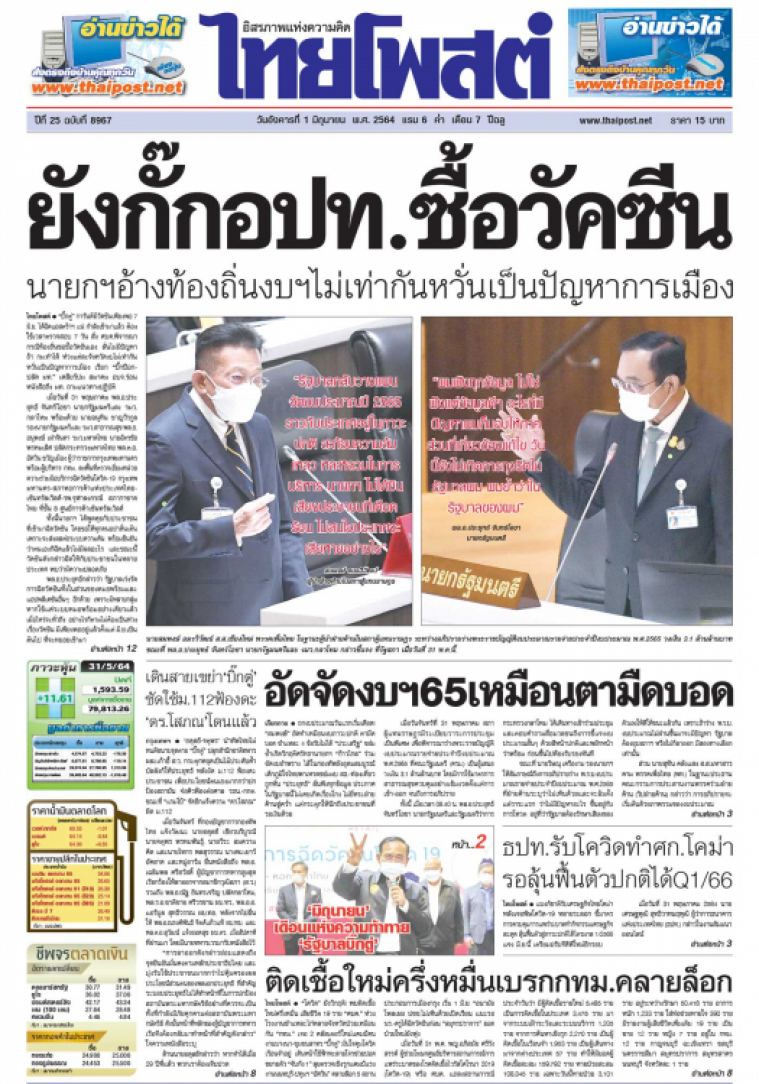 "โควิด" ยังวิกฤติ! พบติดเชื้อใหม่ครึ่งหมื่น เสียชีวิต 19 ราย "ศบค." ห่วงโรงงานชำแหละไก่หลายจังหวัดป่วยเหมือนกัน "กทม." เจอ 2 คลัสเตอร์ใหม่แคมป์คนงานบางนา-ชุมชนสาทร "บิ๊กตู่" มั่นใจคุมโควิดเรือนจำอยู่ เดินหน้าใช้ฟ้าทะลายโจรช่วยปอดขยายตัว "จับกัง 1" ลุยตรวจเชิงรุกแคมป์แรงงานนนทบุรี-ปทุมฯ "อัศวิน" คลายล็อก 5 สถานประกอบการเมืองกรุง เริ่ม 1 มิ.ย. "อนามัยโพลเผย ปชช.ไม่เห็นด้วยเปิดเรียน แนะรอ นร.-ครูได้ฉีดวัคซีนก่อน "สมุทรปราการ" ยอดป่วยใหม่ยังพุ่ง