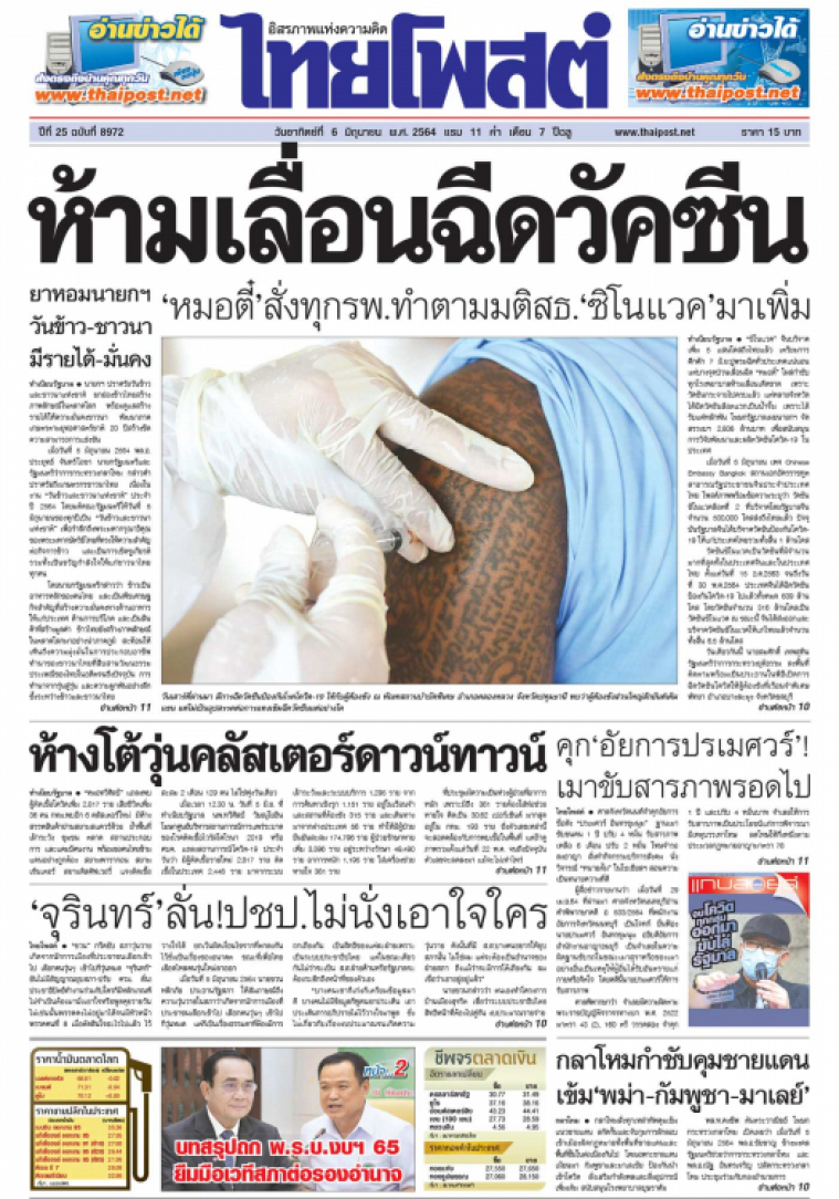"ซิโนแวค" จีนบริจาคเพิ่ม 5 แสนโดสถึงไทยแล้ว เตรียมการคึกคัก 7 มิ.ย.ปูพรมฉีดทั่วประเทศแน่นอน แต่บางจุดป่วนเลื่อนฉีด "หมอตี๋" โผล่กำชับทุกโรงพยาบาลห้ามเลื่อนเด็ดขาด เพราะวัคซีนกระจายไปครบแล้ว แต่หลายจังหวัดได้ฉีดวัคซีนล็อตแรกเป็นน้ำจิ้ม เพราะได้รับแค่หลักพัน โฆษกรัฐบาลเผย นายกฯ จัดสรรงบฯ 2,806 ล้านบาท เพื่อสนับสนุนการวิจัยพัฒนาและผลิตวัคซีนโควิด-19 ในประเทศ
