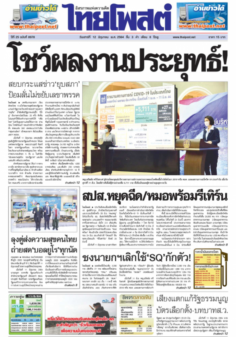 ประกันสังคมเลื่อนฉีดวัคซีน 45 ศูนย์ทั่วกรุง! อ้างปิดปรับปรุงสถานที่และระบบเปิดอีกครั้ง 28 มิ.ย. "หมอหนู" ปัดไม่เกี่ยวกับ สธ. ยันส่งวัคซีนให้ตามคำขอทุกอย่าง แจงแอสตร้าฯ ทยอยมาทุกสัปดาห์ไม่ขาดช่วงแน่ มั่นใจ 2-3 เดือนเห็นผล รัฐบาลสรุป 4 วันฉีดแล้ว 5.6 ล้านโดส ลุยนิคมอุตสาหกรรมนำร่องที่ระยอง "หมอพร้อม" คัมแบ็กเปิด ปชช.ทั่วไปลงทะเบียนจอง 24 มิ.ย. อย.แจ้งข่าวดี "ไฟเซอร์" ยื่นขอทะเบียนแล้ว "ซิโนฟาร์ม" ดีเดย์ 25 มิ.ย.นี้