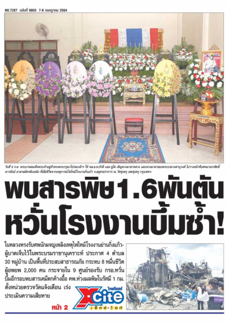 ในหลวงทรงรับศพนักผจญเพลิงเหตุไฟไหม้โรงงานย่านกิ่งแก้ว-ผู้บาดเจ็บไว้ในพระบรมราชานุเคราะห์ ประกาศ 4 ตำบล 30 หมู่บ้าน เป็นพื้นที่ประสบสาธารณภัย กระทบ 8 หมื่นชีวิต ผู้อพยพ 2,000 คน กระจายใน 9 ศูนย์รองรับ กรอ.หวั่นบึ้มอีกรอบพบสารเคมีตกค้างอื้อ คพ.ห่วงมลพิษในรัศมี 1 กม. ตั้งหน่วยตรวจวัดแจ้งเตือน เร่งประเมินความเสียหาย
