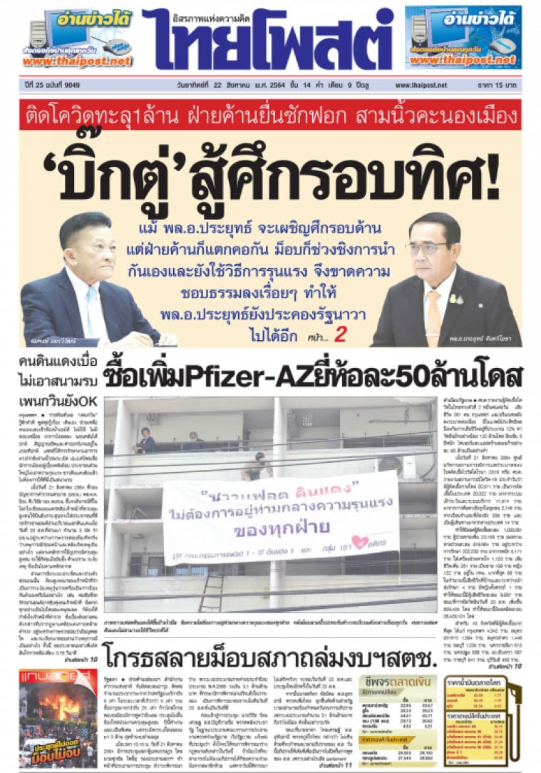 ราชทัณฑ์เผย "เพนกวิน" รู้สึกตัวดี พูดคุยรู้เรื่อง เดินเอง ช่วยเหลือตนเองและเข้าห้องน้ำเองได้ ไม่มีไข้ ไม่มีหอบเหนื่อย อาการไอลดลง นอนหลับได้ปกติ สัญญาณชีพและค่าออกซิเจนอยู่ในเกณฑ์ปกติ แพทย์ให้การรักษาตามอาการ ตร.ฝากขังสามนิ้วขนระเบิด เอแบคโพลเชื่อนักการเมืองอยู่เบื้องหลังม็อบ ประชาชนส่วนใหญ่ไม่เอาความรุนแรง ชาวดินแดงฮือแล้ว ไม่ต้องการให้ที่นี่เป็นสนามรบ