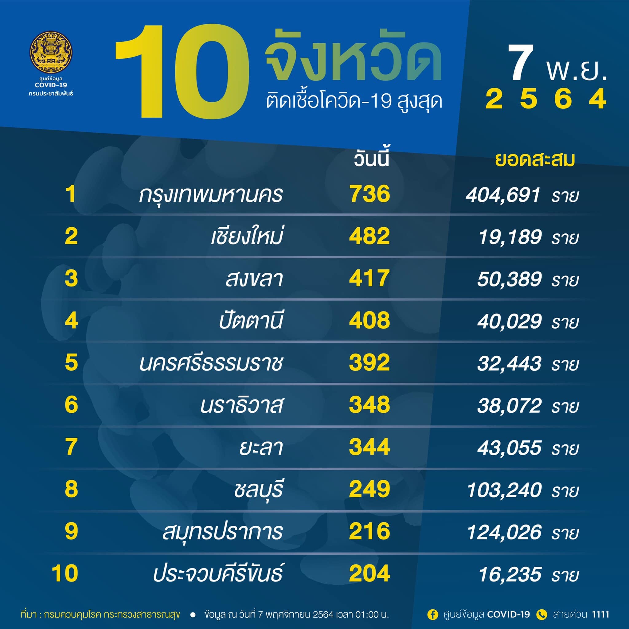 สำหรับ 10 จังหวัดที่มีผู้ติดเชื้อสูงสุดวันที่ 7 พ.ย. ได้แก่ กทม. 736 ราย เชียงใหม่ 482 ราย สงขลา 417 ราย ปัตตานี 408 ราย นครศรีธรรมราช 392 ราย นราธิวาส 348 ราย ยะลา 344 ราย ชลบุรี 249 ราย สมุทรปราการ 216 ราย และประจวบคีรีขันธ์ 204 ราย