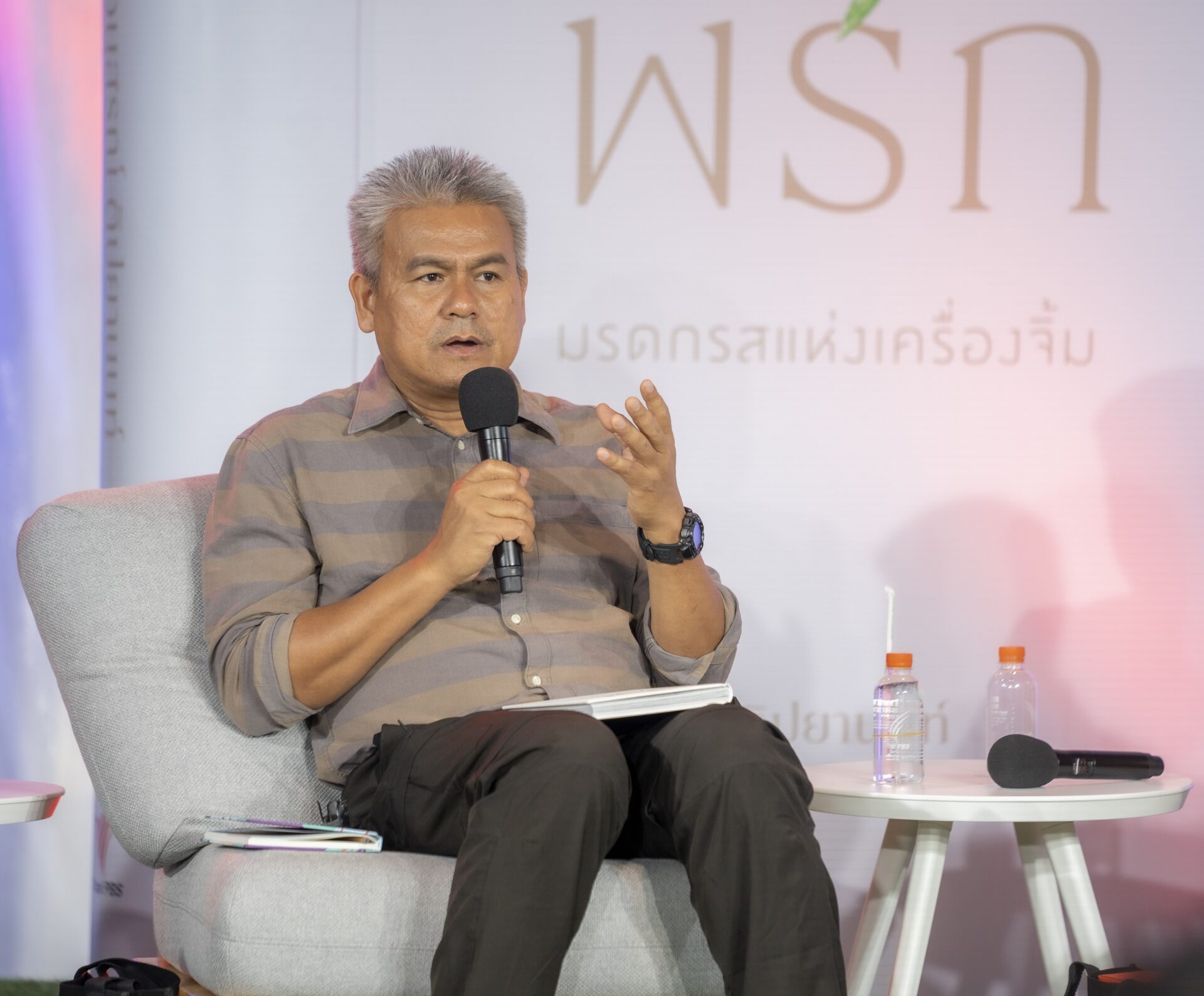 เสรี รุ่งสว่าง นักร้องลูกทุ่งเจ้าของเพลง “เทพธิดาผ้าซิ่น” ที่มีน้ำพริกคู่บ้าน มาตำน้ำพริกถ้วยเด็ดบางปลาม้า จ.สุพรรณบุรี ก่อนร่วมวงเสวนา เสรีบอกว่าอดีตหน้าน้ำหลาก น้ำท่วม 6 เดือน จะเก็บผักบุ้งตามท้องไร่ท้องนา แล้วมาตำน้ำพริกกะปิ ทำผักบุ้งดองสด จากประสบการณ์เดินทางไปแสดงทั่วประเทศ น้ำพริกแต่ละภาคต่างกัน น้ำพริกปลาร้าอีสานก็ไม่เหมือนภาคกลาง ส่วนภาคใต้น้ำพริกตำละเอียด รสจัดจ้านจี๊ดจ๊าดเหมือนสุพรรณบุรี ส่วนภาคเหนือน้ำพริกอ่อง เปรี้ยว เค็ม หวาน เผ็ดเล็กน้อย ในวิถีคนไทยน้ำพริกไม่เคยขาด น้ำพริกไม่เคยตกยุค ตนชอบน้ำพริกปลาทู ชอบป่นใส่ปลาร้า ประเทศไทยเป็นที่หนึ่งด้านอาหารในโลก อยากให้คนไทยภาคภูมิใจในอาหารไทย น้ำพริกไทย