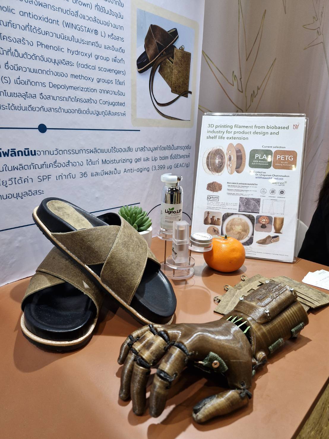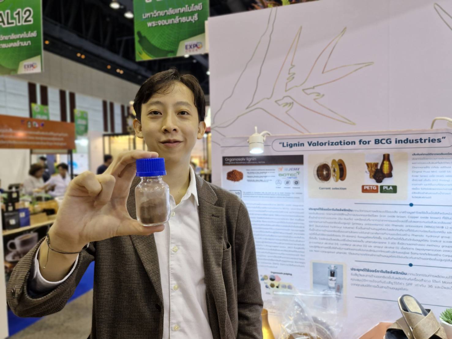 จากการวิจัยร่วมกันโดยใช้ห้องปฏิบัติการร่วมด้านพลังงานและเคมีชีวภาพ (BIOTEC-JGSEE Integrative Biorefinery Laboratory) ได้ค้นพบศักยภาพของลิกนินในการพัฒนาผลิตภัณฑ์ที่ยั่งยืนในหลากหลายอุตสาหกรรม เช่น การพัฒนาพลาสติกผสมลินินที่สามารถกันรังสียูวีได้โดยไม่ต้องพึ่งพาสารเคมี และผลิตเป็น “กรีนแพคเกจจิ้ง” ด้วยการผสมลิกนินเข้ากับพลาสติกชีวภาพ เช่น PLA (พลาสติกย่อยสลายได้) และ พลาสติก Up-cyling rPET (พลาสติกทนความร้อนและยืดหยุ่นสูง) เพื่อพัฒนาบรรจุภัณฑ์ที่ทนต่อรังสียูวี ลดการเสื่อมสภาพ และตอบโจทย์ความยั่งยืน เหมาะสำหรับผลิตภัณฑ์ที่ต้องการคุณภาพและความปลอดภัยจากแสงยูวี