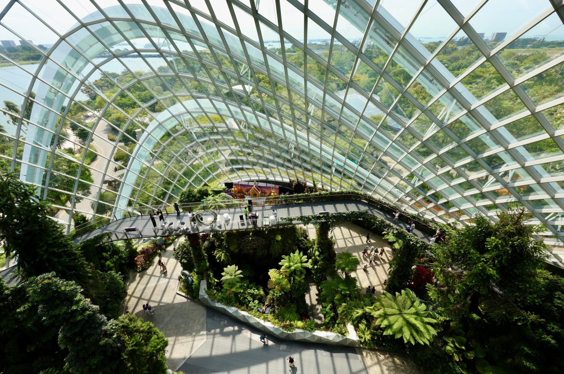 พิกัดต่อมาที่ Gardens by the Bay เป็น Flower Dome เรือนกระจกแก้วที่ใหญ่ที่สุดในโลก นอกจากดอกไม้ทั่วโลกที่จัดแสดงส่งกลิ่นหอม ช่วงที่ไปจัดกิจกรรมพิเศษชื่อ “Spring Blossoms Legend of Lady White Snake “ โดดเด่นด้วยการจัดสวนดอกไม้บานสะพรั่งด้วยศิลปะและสถาปัตยกรรมแดนมังกร มีประติมากรรมดอกไม้รูป”นางพญาผมขาว” ที่คนทั่วโลกรู้จักผ่านหนังหรือซีรี่ส์ ซึ่งมาจากตำนานโศกนาฏกรรมความรักจากโลกตะวันออก ซึ่งประจวบเหมาะกับการฉลองตรุษจีน ก่อนจะไปชมสวนต่างๆ ที่ดึงดูดใจไม่แพ้กัน มีประติมากรรมจากศิลปินทั่วโลกจัดแสดงกลมกลืนกับสวน ให้มาถ่ายรูปกันได้ด้วย ถ้าดูจากแผนที่สวนสามารถใช้เวลาอยู่ที่นี่ได้ตั้งแต่เช้า 9.00 น.- 21.00 น. สวนแห่งนี้จะสวยงามมากเป็นพิเศษยามค่ำคืน เมื่อต้นไม้ Supertrees สว่างไสวขึ้น ไว้โอกาสหน้ามาดูงานไฟกลางคืน ซึ่งแต่ละโซนจะมีค่าตั๋ว แนะนำให้วางแผนก่อนเที่ยว