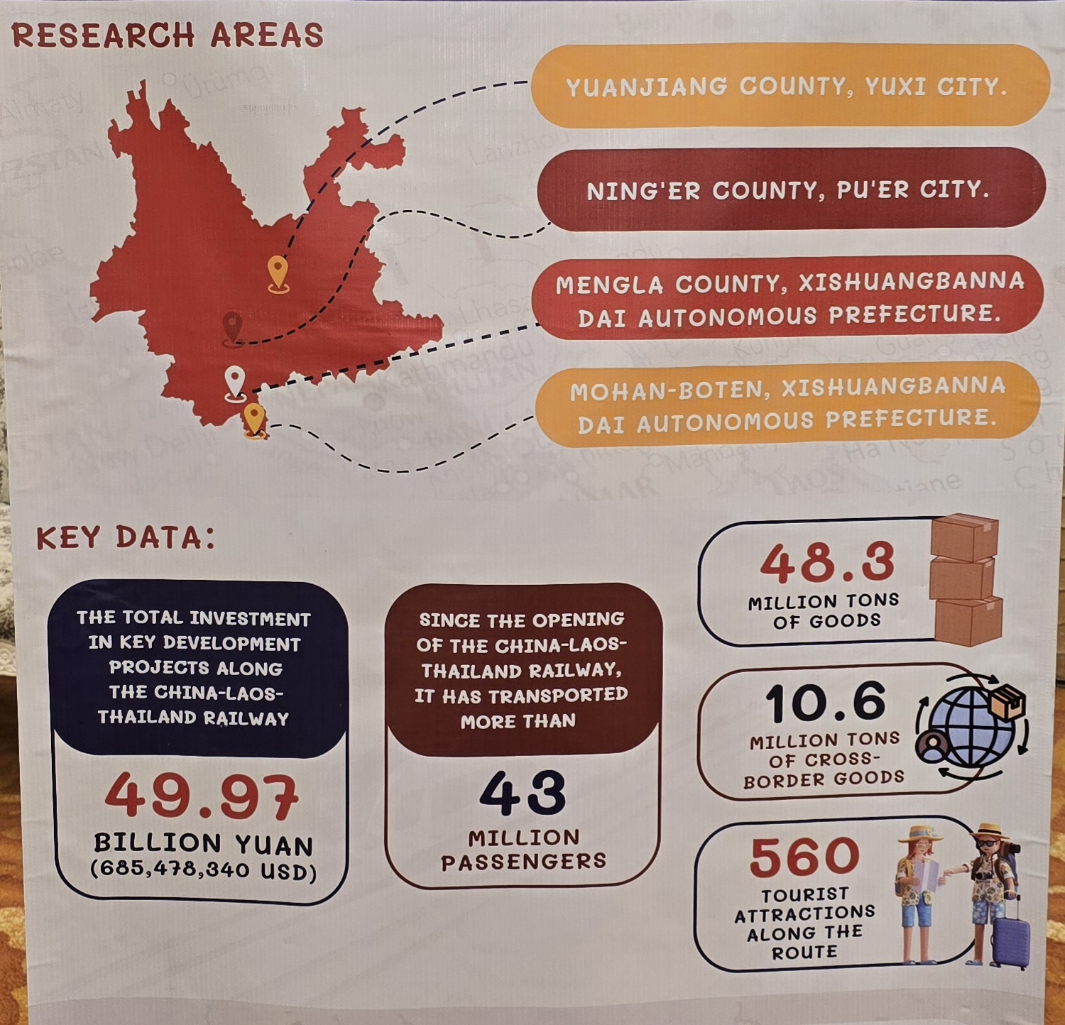 Prof. Tian Qian กล่าวต่อว่า โมเดลความร่วมมือระหว่างรัฐบาล วิสาหกิจ และประชาชนที่นำมาใช้ในโครงการนี้ ถือเป็นตัวอย่างความสำเร็จให้กับโครงการขนาดใหญ่ในภูมิภาคอื่นๆ ทั้งนี้พื้นที่การวิจัยสำคัญที่เกี่ยวข้องกับโครงการประกอบด้วย เขตหยวนเจียง เมืองหยูซี, เทศมณฑลหนิงเออร์ เมืองปูเออร์, เทศมณฑลเม็งลา และเขตโมฮัน-โบเตน ในเขตปกครองตนเองสิบสองปันนาได ซึ่งทั้งหมดล้วนมีบทบาทสำคัญในการพัฒนาระเบียงเศรษฐกิจจีน-คาบสมุทรอินโดจีน นับตั้งแต่เปิดใช้งานเมื่อสามปีก่อน โครงการนี้ได้ขนส่งผู้โดยสารไปแล้วกว่า 43 ล้านคน และสินค้าทางรถไฟกว่า 48 ล้านตัน รวมถึงสินค้าข้ามพรมแดนกว่า 1.5 ล้านตัน