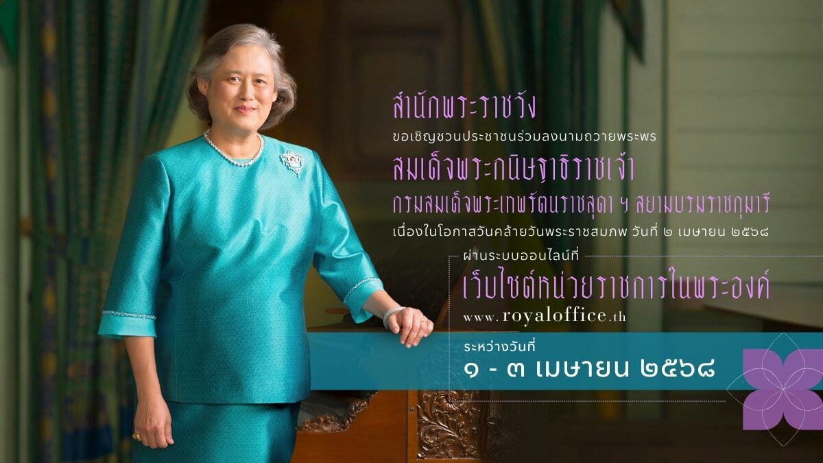 1 เม.ย.2568 – สำนักพระราชวัง ขอเชิญชวนประชาชนร่วมลงนามถวายพระพร สมเด็จพระกนิษฐาธิราชเจ้า กรมสมเด็จพระเทพรัตนราชสุดา เจ้าฟ้ามหาจักรีสิรินธร มหาวชิราลงกรณวรราชภักดี สิริกิจการิณีพีรยพัฒน รัฐสีมาคุณากรปิยชาติ สยามบรมราชกุมารี เนื่องในโอกาสวันคล้ายวันพระราชสมภพ วันที่ 2 เมษายน 2568 ผ่านระบบออนไลน์ ที่เว็บไซต์หน่วยราชการในพระองค์ www.royaloffice.th ระหว่างวันที่ 1 ถึง 3 เมษายน 2568